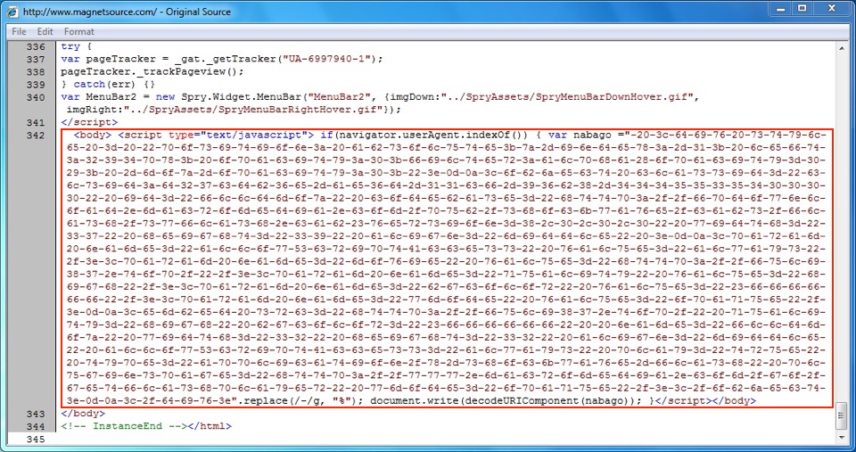 Shown above: An example of injected script in a page from the first compromised site pointing to an EITest gate.