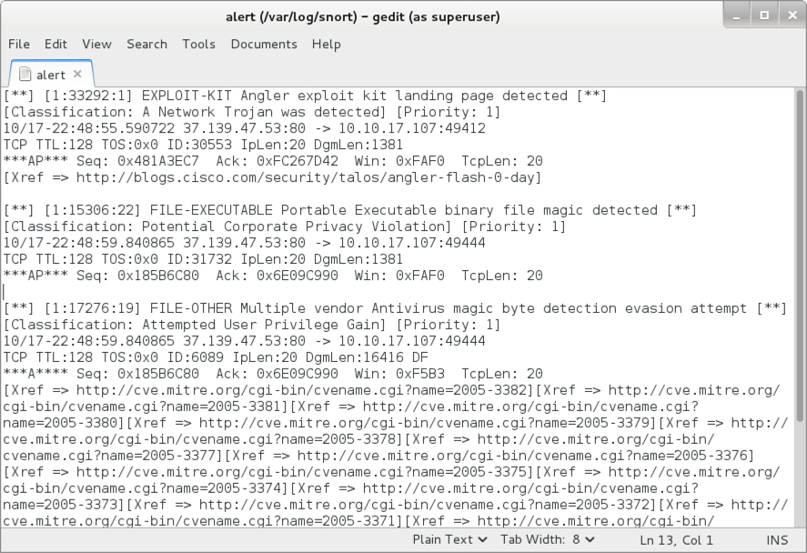 Shown above: Notable alerts on the traffic in Snort using the Snort subscriber ruleset.