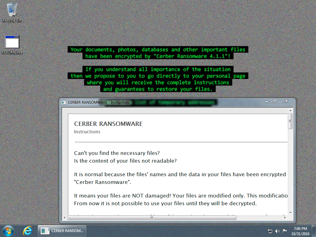 Shown above: Desktop of an infected Windows host after rebooting. Looks like Cerber ransomware is up to version 4.1.1.