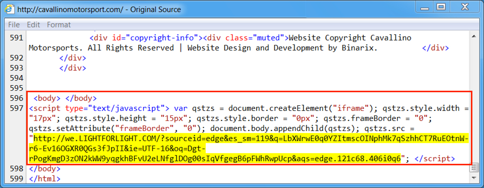 Shown above: Injected script from the EITest campaign in a page from the compromised site.