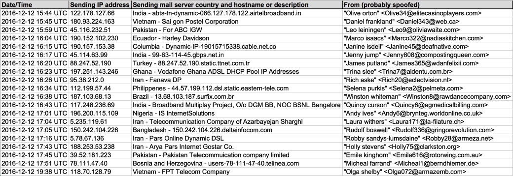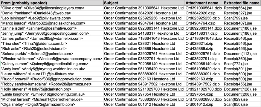 Shown above: Data from 20 emails pushing Locky ransomware (part 1 of 2).