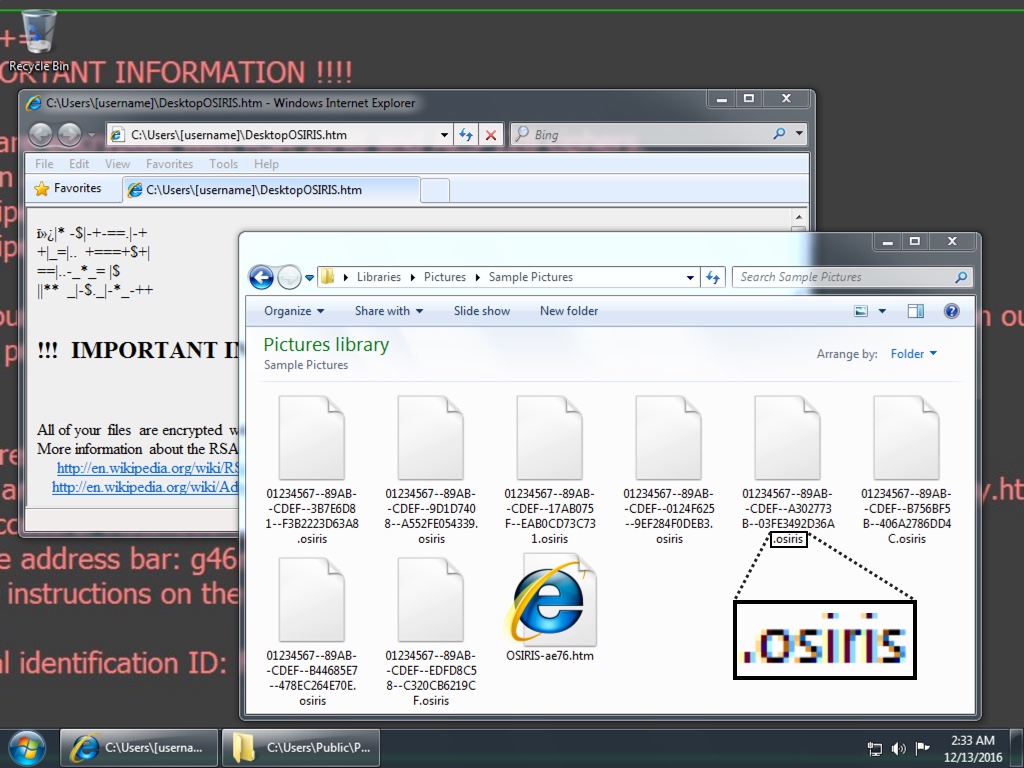 Shown above: Screen shot from an infected Windows desktop. Note the .osiris file extension.