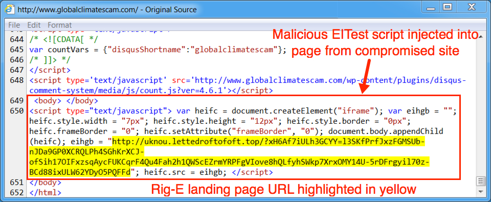 Shown above: Injected script from the EITest campaign from the compromised site.
