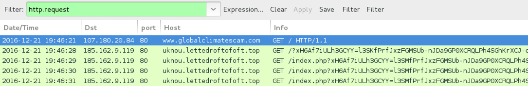 Shown above: Pcap of the infection traffic filtered in Wireshark.