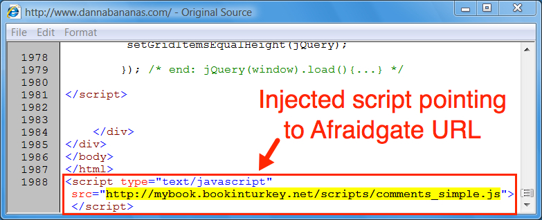 Shown above: Page from the compromised website with injected script leading to an Afraidgate redirect URL.