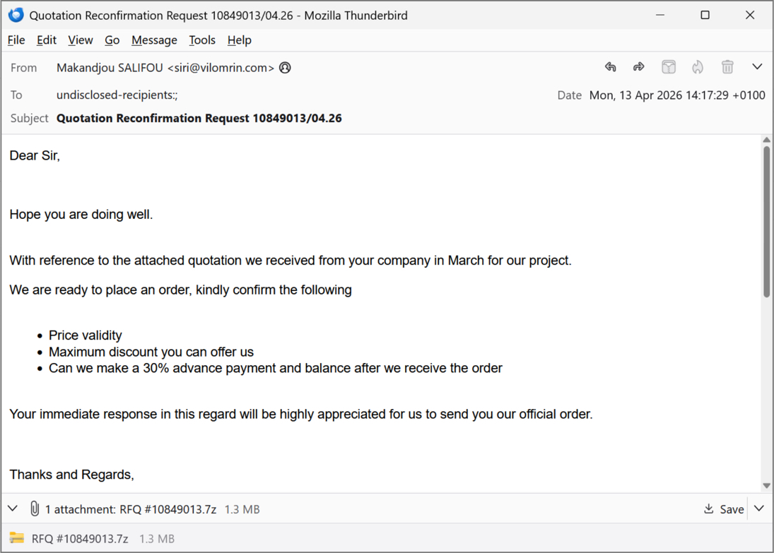 2026-04-13 (MONDAY): XLOADER (FORMBOOK) FROM EMAIL ATTACHMENT SELECT EMAIL HEADERS/INFO: - Received: from vilomrin.com (vilomrin[.]com [185.117[.]90.2]) by [information removed]; Mon, 13 Apr 2026 15:46:22 +0200 (CEST) - Date: Mon, 13 Apr 2026 14:17:29 +0100 - From: Makandjou SALIFOU- Subject: Quotation Reconfirmation Request 10849013/04.26 - Attachment filename: RFQ #10849013.7z ATTACHMENT: - SHA256 hash: 6e6eec005d21335366a91f6d53dd1a82a0558b870121ca124d02754fd96a3c3f - File size: 1,402,182 bytes - File name: RFQ #10849013.7z - File type: RAR archive data, v5 EXTRACTED MALWARE: - SHA256 hash: 9297af5f66486d11540f15b44d4b6beec6ff89dbc4dcdee898db9a7daaa76085 - File size: 2,064,350 bytes - File name: RFQ #10849013.js - File type: ASCII text, with very long lines, with no line terminators - File description: Text-based script file for XLoader (Formbook) FILE DROPPED AND DELETED DURING THE INFECTION: - SHA256 hash: 8e60280c59b760a2e8c88d51e9fc8cb68c9ebe55b15106bd127cfdabab740bfc - File size: 1,500,777 bytes - File location: C:\Temp\ps_NeHt4dsB3IS3_1776200612713.ps1 - File type: ASCII text, with CRLF, LF line terminators - File description: PowerShell script file for XLoader (Formbook) 29 DOMAINS SEEN IN POST-INFECTION TRAFFIC: - www.3700421[.]xyz - www.aistero[.]store - www.aitutoring[.]vip - www.brockenbow[.]com - www.cinella[.]life - www.f6731[.]com - www.gradlist[.]ru - www.helpierus[.]ru - www.istrakabiinw[.]info - www.kanui[.]com[.]br - www.kelimemaster[.]com[.]tr - www.optickjawabarat[.]online - www.pechimag-ekb[.]ru - www.pevnenko[.]tech - www.scbcgm[.]com - www.simonidapure[.]net - www.smarte3info[.]fr - www.smartfavesden[.]shop - www.sololevelingshop[.]co[.]uk - www.sqws-adguard[.]co[.]in - www.sy-idea[.]com - www.thesisclaw[.]xyz - www.tradox[.]rest - www.troitt[.]com - www.trylegbots[.]com - www.vianovamobility[.]shop - www.vk-mellstroy[.]online - www.von-tors[.]ru - www.x5js8[.]click