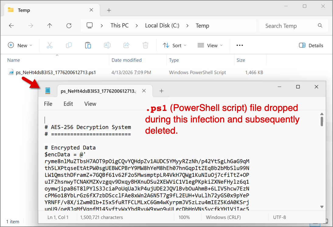 Shown above: PowerShell script file dropped and deleted during the infection.